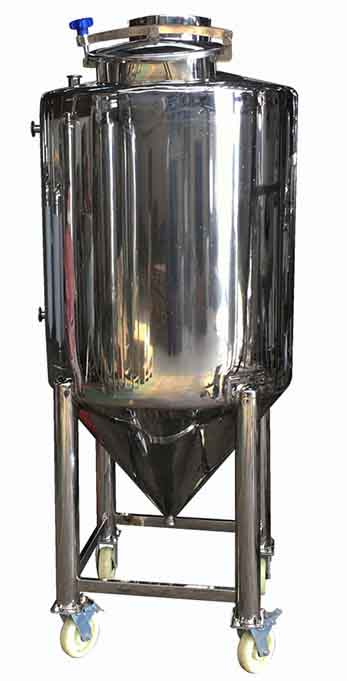 啤酒發酵罐罐體為圓柱形,頂蓋為碟形,底蓋為采用60°~90°傾斜度的錐形有利于罐中酒液對流強烈,發酵速度快,而且利于排放酵母和發酵罐中雜質;在酒精發酵過程中,為了回收CO2氣體及其所帶出的部分酒精,發酵罐宜采用密閉式.罐底部有手孔、與罐頂連接的CO2、空氣、CIP等的進出管、內容物容積測量裝置、空罐探頭及保壓裝置等.